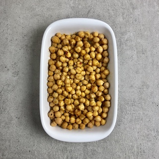 Préchauffez le four en mode grill. Égouttez les pois chiches, rincez-les puis séchez-les à l’aide d’un torchon propre. Versez les pois chiches dans un plat allant au four, arrosez-les de 3 cuillères à soupe d’huile d’olive, 1 cuillère à café de poudre de curry et une pincée de sel. Mélangez et enfournez pendant environ 10 minutes.