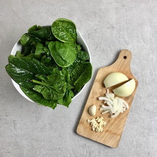 Épluchez et émincez l’oignon et les gousses d’ail. Lavez les feuilles d’épinards.
