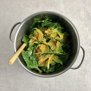 Dans un faitout, faites revenir 3 minutes l’oignon et les gousses d’ail avec 1 cuillère à café de poudre de curry. Ajoutez ensuite les épinards. Versez 75cl d’eau (ne versez pas d’eau à niveau car les épinards rendent beaucoup d’eau en cours de cuisson). Assaisonnez avec du sel, du poivre et 1 cuillère à café de poudre de curry. Portez à ébullition puis laissez cuire à couvert à feu doux environ 10 minutes.