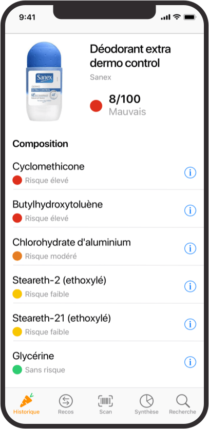 Yuka analyse les produits cosmétiques et d'hygiène. Vous accédez aux détails de la composition du produit pour comprendre son évaluation.