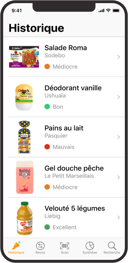 Yuka affiche l'historique des produits scannés. Vous identifiez l'impact de chaque produit sur la santé via un code couleur simple.