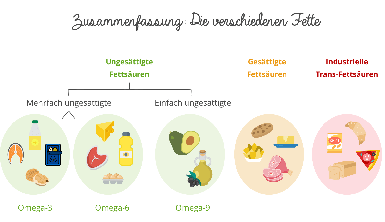Die ungesättigten Fettsäuren werden in 3 Kategorien eingeteilt: Omega-3, Omega-6 und Omega-9.