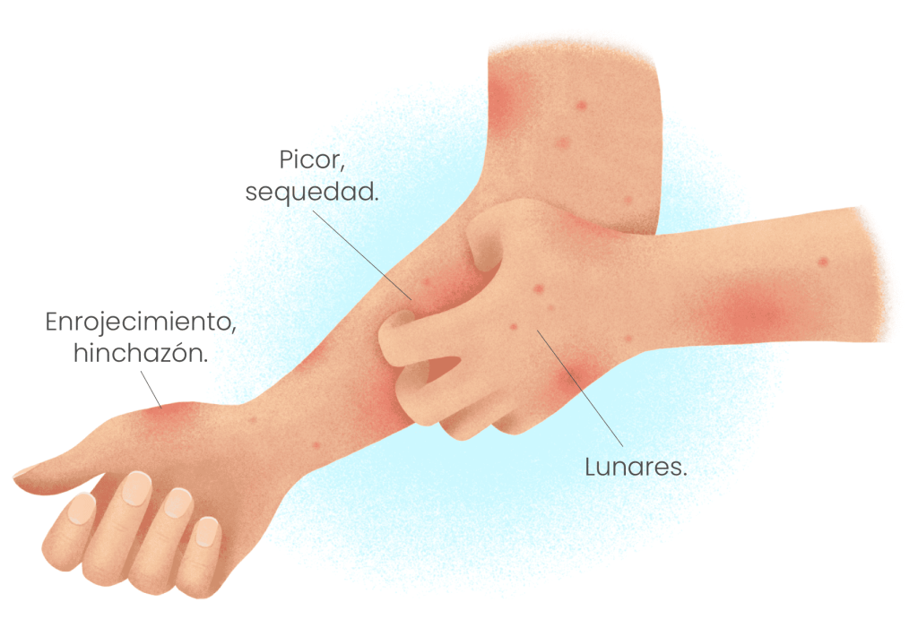 Tras la fase de sensibilización silenciosa, que puede durar varios meses, años o incluso décadas, cada contacto provoca una reacción cutánea en un plazo de 24 a 72 horas. Esto puede dar lugar a diversos síntomas: picor intenso, enrojecimiento, hinchazón, piel seca, aparición de pequeñas ampollasb y otros7. ¡Ay!
